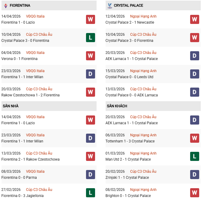 Bên phía Crystal Palace, chiến thắng 3-0 ở lượt đi giúp đại diện Ngoại hạng Anh nắm lợi thế cực lớn. Phong độ của Palace cũng đang rất ấn tượng với chuỗi 5 trận bất bại, trong đó có các chiến thắng trước Newcastle và chính Fiorentina. Với lợi thế dẫn sâu, đội khách nhiều khả năng sẽ chơi chặt chẽ, chờ đợi thời cơ phản công từ tốc độ của các mũi nhọn phía trên.