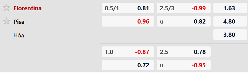 Thông tin tỷ lệ kèo Fiorentina vs Pisa: