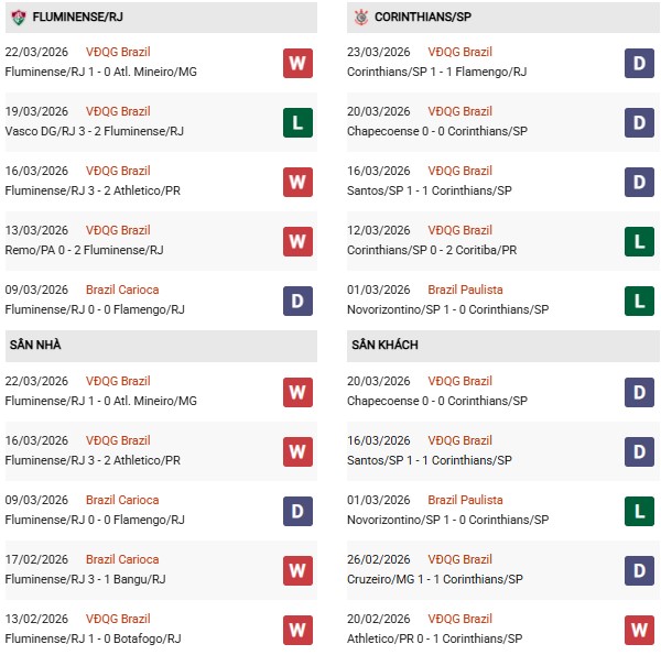 Thống kê phong độ Fluminense vs Corinthians: