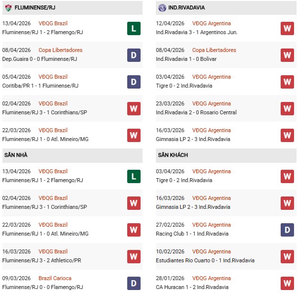 Thống kê phong độ Fluminense vs Ind. Rivadavia: