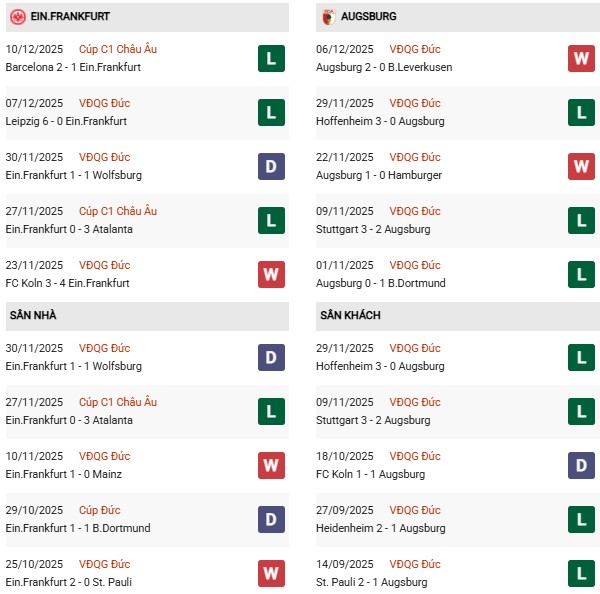 - Trên sân nhà, Frankfurt thắng 4, thua 2 trước Augsburg.