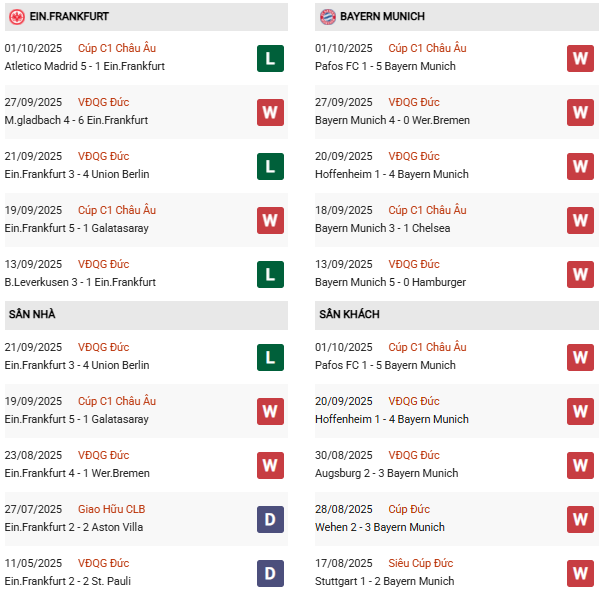 Thống kê phong độ Frankfurt vs Bayern Munich: