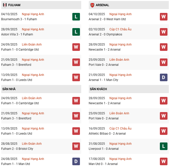 - Fulham thắng 1, hòa 3, thua 6 trong 10 trận gặp Arsenal gần đây.