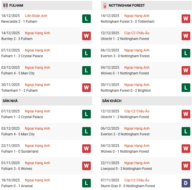 Thống kê phong độ Fulham vs Nottingham:
