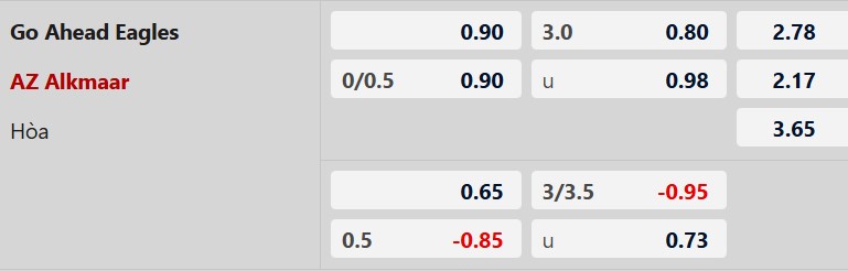 Mức chấp 1/4 là khá khiêm tốn đối với một đội bóng cửa trên như AZ Alkmaar. Nếu nhìn vào lịch sử đối đầu, AZ Alkmaar thường xuyên "át vía" đội chủ sân De Adelaarshorst với những chiến thắng cách biệt lớn (như các trận thắng 3-0 hoặc 4-1 trong quá khứ). Trong bối cảnh GA Eagles thường chơi hớ hênh trước các đội bóng lớn (thua Twente 1-4 ngay tại sân nhà), bản lĩnh của AZ Alkmaar sẽ là chìa khóa để họ vượt rào thành công.