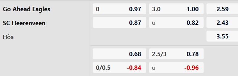 Mức kèo châu Á 0:0 phản ánh sự cân bằng giữa hai đội. GA Eagles có lợi thế sân nhà nhưng lại thiếu sự sắc bén ở hàng công, trong khi Heerenveen nhỉnh hơn đôi chút về khả năng giành chiến thắng nhưng thiếu ổn định. Trong bối cảnh cả hai đều ưu tiên việc không thua hơn là mạo hiểm tìm chiến thắng, thế trận giằng co nhiều khả năng sẽ diễn ra.