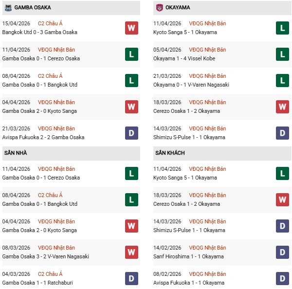 - Trên sân nhà, Gamba Osaka thắng 1, thua 1 trước Okayama.