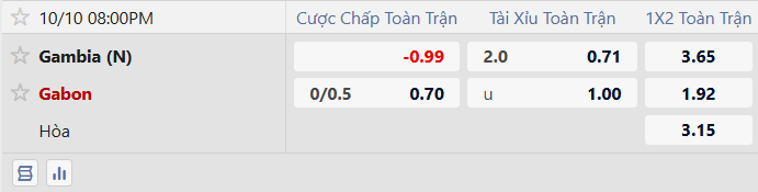 Điểm ăn ở cửa Tài 2 hòa đã giảm xuống còn 0.71. Có thể thấy niềm tin lớn dồn vào khả năng trận đấu có nhiều bàn thắng. Thống kê cho thấy 3/5 trận đấu gần đây của Gambia và 4/6 trận gần đây của Gabon nổ Tài. Trận lượt đi của hai đội cũng có 5 bàn.