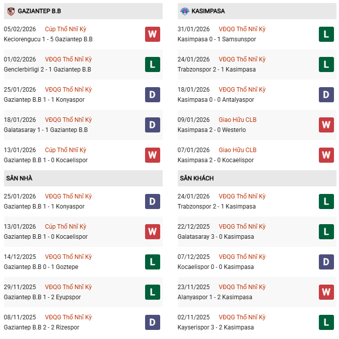 Thống kê phong độ Gaziantep vs Kasimpasa: