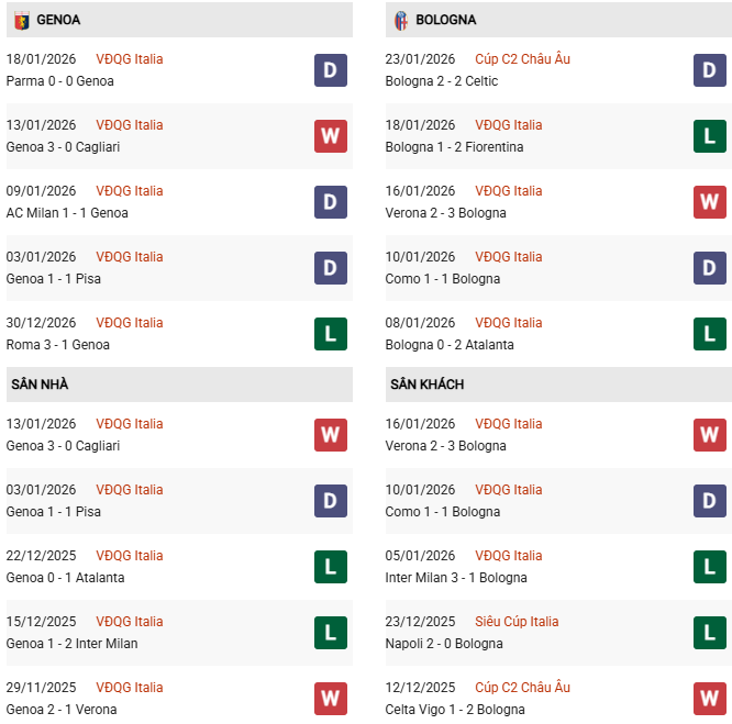 - Genoa thắng 5, hòa 3, thua 2 trong 10 trận gặp Bologna gần đây.