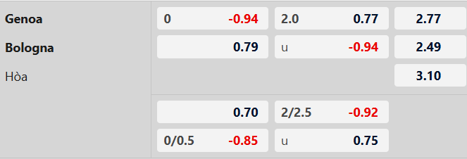 Thông tin tỷ lệ bóng đá Genoa vs Bologna: