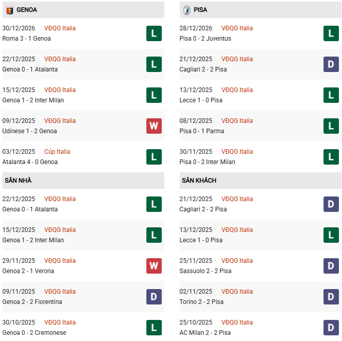- Genoa thắng 1, hòa 1 trong 2 trận gặp Pisa gần đây.