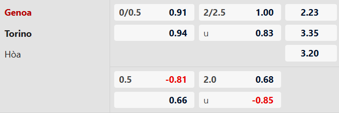 Thông tin tỷ lệ Genoa vs Torino: