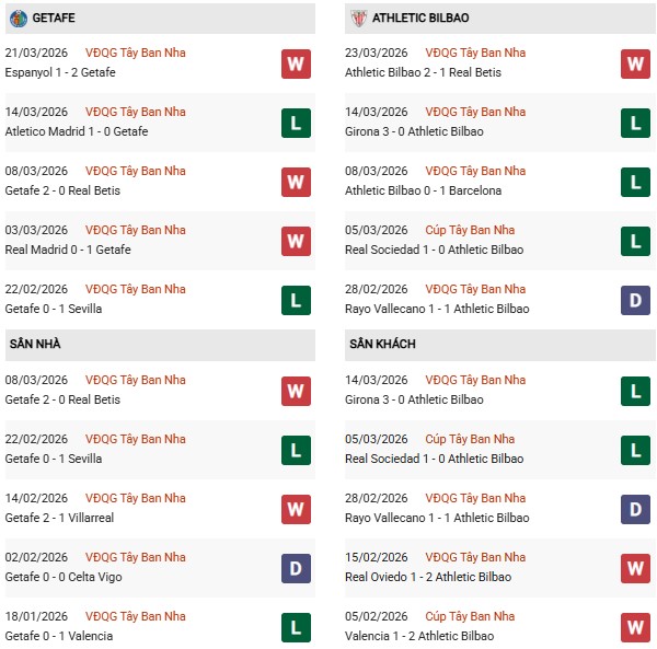 - Trên sân nhà, Getafe thắng 1, thua 4 trước Athletic Bilbao.