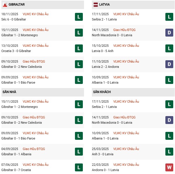 - Trên sân nhà, Gibraltar thắng 1, thua 2 trước Latvia.