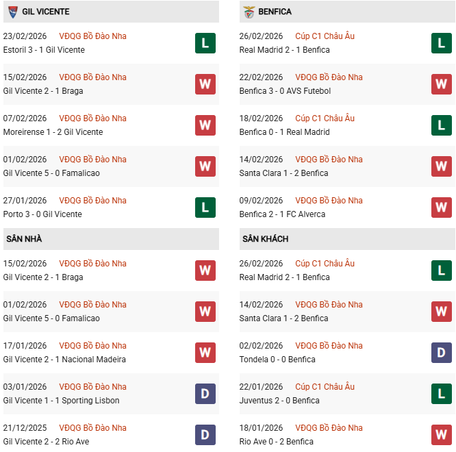 Tuy nhiên, đội chủ nhà lại không được lịch sử ủng hộ. Với việc đã trắng tay trong cả 7 trận gặp Benfica gần đây, khả năng cao là Gil Vicente sẽ lại phải nhận kết cục buồn.