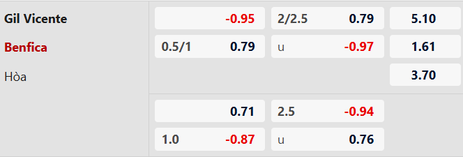 Benfica thắng hiệp 1 theo châu Á: Gil Vicente thua hiệp 1 theo châu Á ở cả 5 trận gặp Benfica gần nhất. Đá với Befica đang có chuỗi 4 trận thắng hiệp 1 theo châu Á liên tiếp, đội chủ nhà không phải là sự lựa chọn đáng tin trước giờ nghỉ.