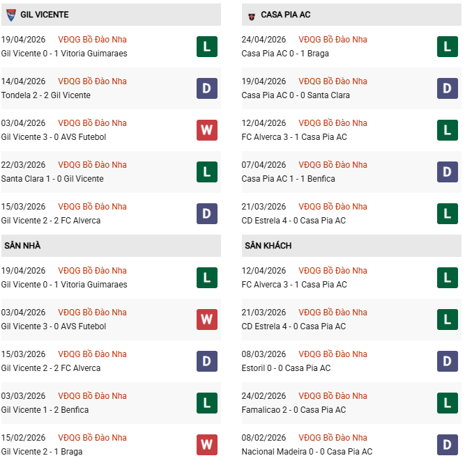 - Gil Vicente thắng 1 thua 1 và hòa 3 trong 5 lần gần nhất gặp Casa Pia AC.