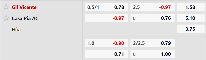 Thông tin tỷ lệ kèo Gil Vicente vs Casa Pia AC: