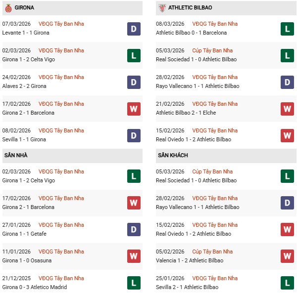 - Trên sân nhà, Girona thắng 3, thua 1 trước Athletic Bilbao.