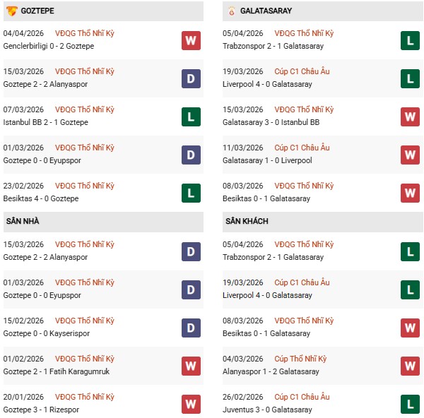 Thống kê phong độ Goztepe vs Galatasaray: