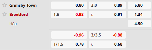 Thông tin tỷ lệ bóng đá Grimsby vs Brentford: