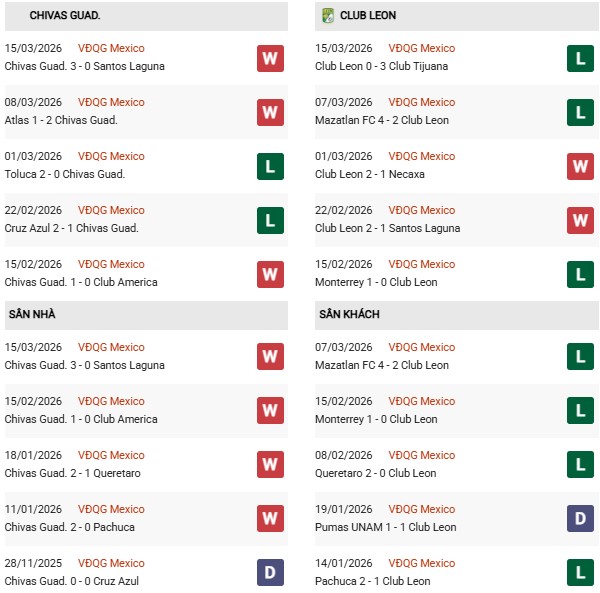 Thống kê phong độ Guadalajara vs Club Leon: