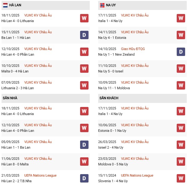 Thống kê phong độ Hà Lan vs Na Uy: