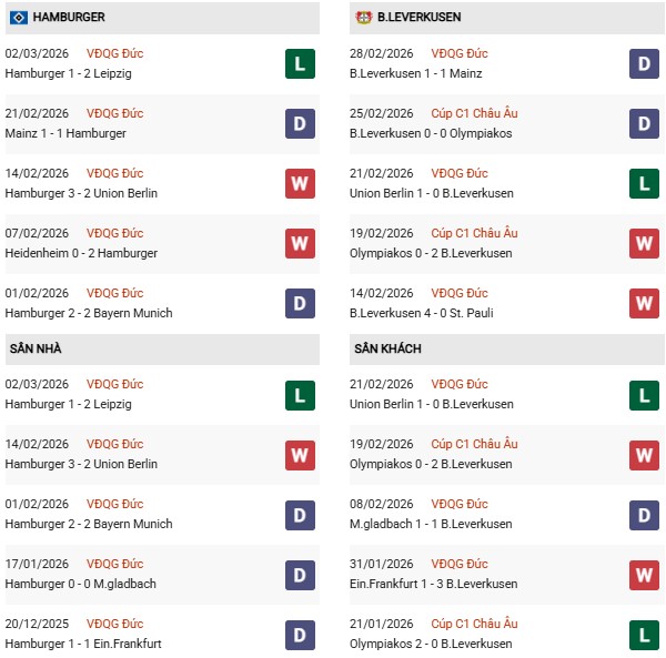 Thống kê phong độ Hamburger vs Leverkusen: