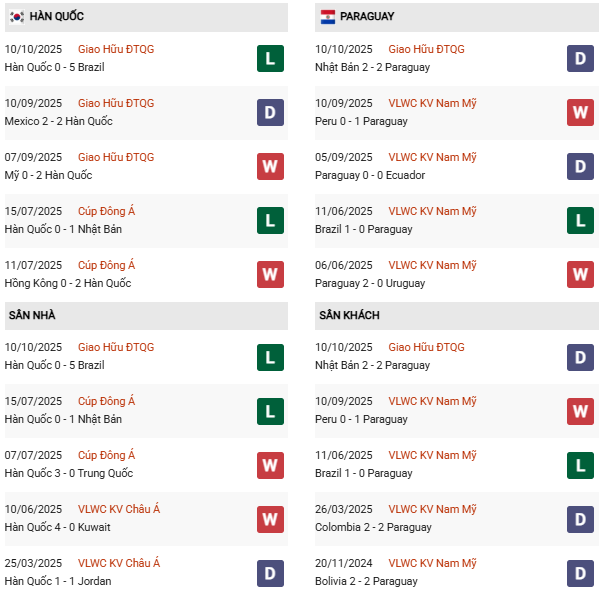 Thống kê phong độ Hàn Quốc vs Paraguay:
