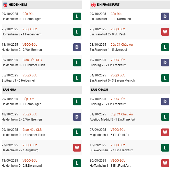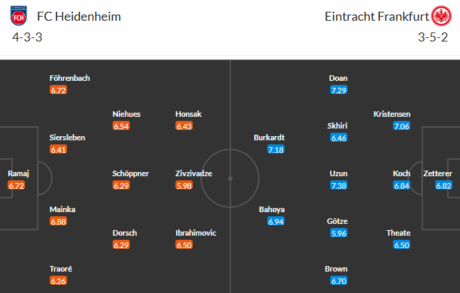 2 lần gặp nhau ở mùa giải năm ngoái, Frankfurt đã có đến 7 lần xé lưới Heidenhiem. Mùa này, dù đang gặp khá nhiều vấn đề về mặt phong độ nhưng Frankfurt vẫn có cho mình đến 21 bàn sau 8 trận Bundesliga. Tuy nhiên, họ cũng phải nhận về đến 18 bàn thua thế nên phần lớn những trận cầu có sự xuất hiện của đội khách luôn có rất nhiều bàn thắng. Kịch bản tương tự khả năng cao sẽ còn lặp lại trước một Heidenheim đang chìm trong khủng hoảng.