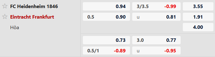 Thông tin tỷ lệ kèo Heidenheim vs Frankfurt: