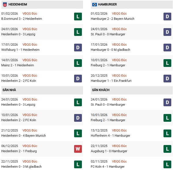 - Trên sân nhà, Heidenheim thắng 2, thua 1 trước Hamburger.