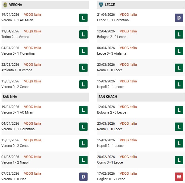 Chính xác Verona đang sở hữu thành tích sân nhà tệ nhất Serie A 2025/26 với vẻn vẹn 1 khúc khải hoàn nhưng trắng tay tới 11 lần sau 16 cuộc tiếp khách. Thực ra phía đối diện, Lecce cũng chỉ bớt tệ hơn một chút quãng thời gian gần đây khi dù sao vừa ngắt được chuỗi 4 thất bại liên tiếp bằng màn chia điểm với Fiorentina.