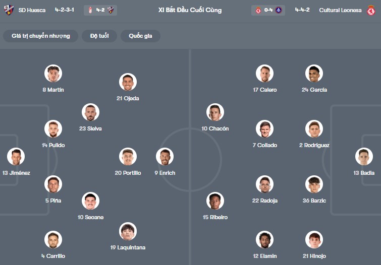 Đội hình dự kiến Huesca vs Cultural Leonesa: