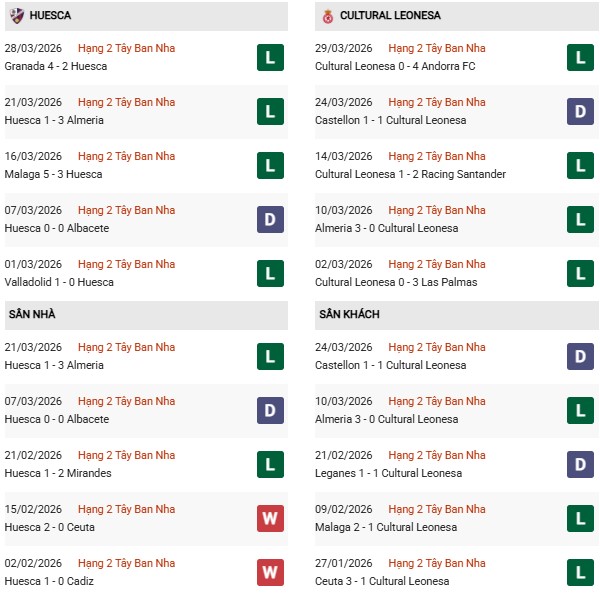 Thống kê phong độ Huesca vs Cultural Leonesa: