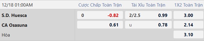 Thông tin tỷ lệ bóng đá Huesca vs Osasuna: