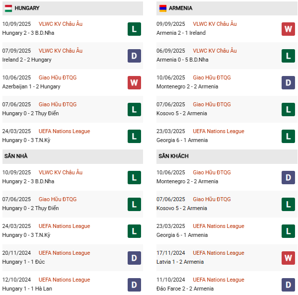 Thống kê phong độ Hungary vs Armenia: