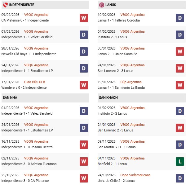Trong khi đó, Independiente đang gặp phải một quá trình thi đấu không mấy ấn tượng khi chỉ thắng 1 trong 5 trận gần nhất. Tuy nhiên, không thể phủ nhận sức mạnh của Independiente trên sân nhà và khả năng gây khó khăn cho Lanús.