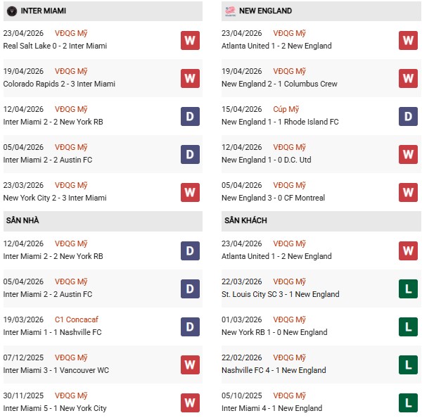 Thống kê phong độ Inter Miami vs New England: