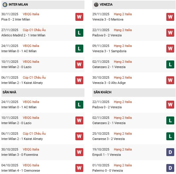 - Trên sân nhà, Inter Milan thắng cả 2 trận trước Venezia.