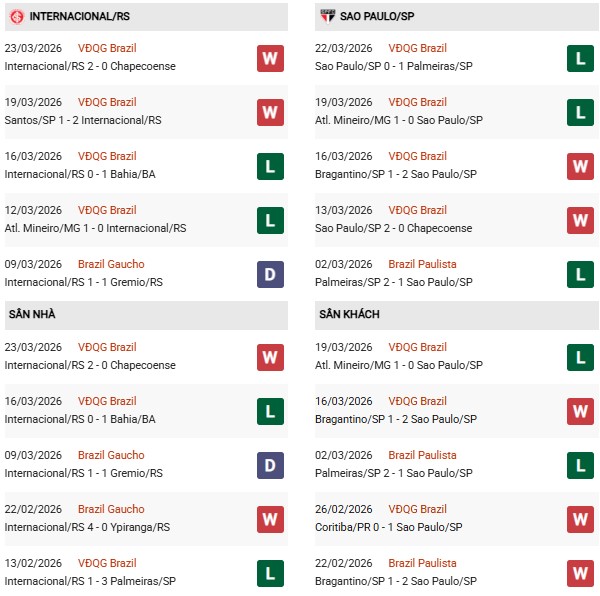 - Internacional thắng 3, hòa 2, thua 5 trong 10 trận gặp Sao Paulo gần đây.
