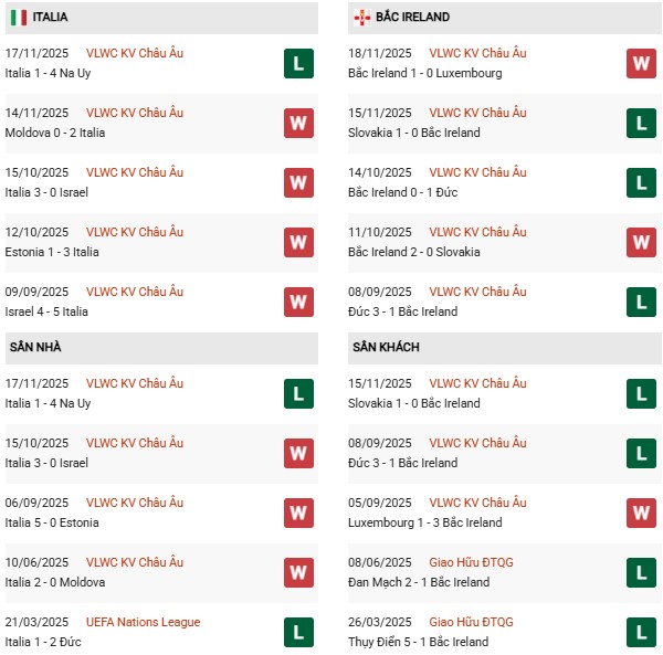 - Trên sân nhà, Italia toàn thắng cả 4 trận trước Bắc Ireland.