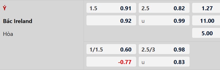 Thông tin tỷ lệ kèo bóng đá Italia vs Bắc Ireland: