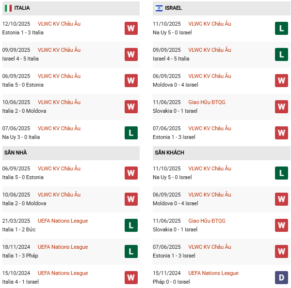 - Trên sân nhà, Italia thắng cả 2 trận trước Israel.
