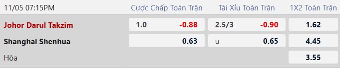 Thông tin tỷ lệ Johor DT đấu với Shanghai Shenhua: