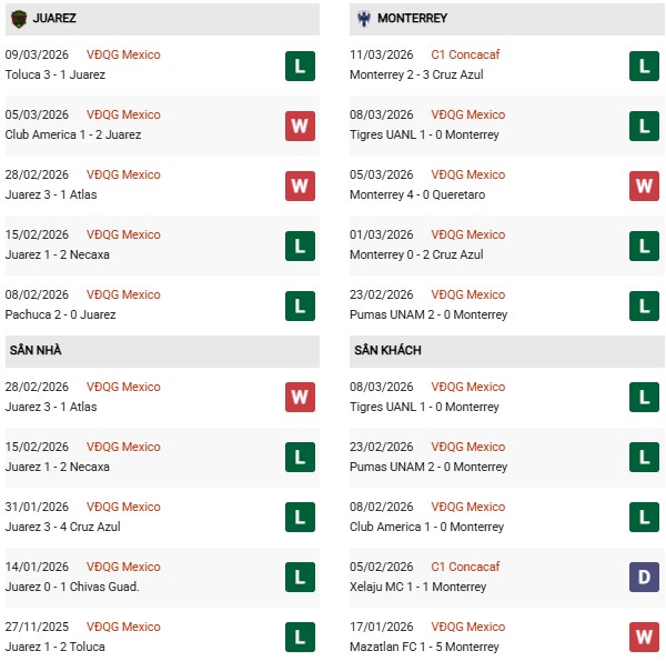 - Juarez thắng 2, thua 8 trong 10 trận gặp Monterrey gần đây.