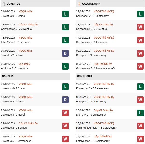 - Trên sân nhà, Juventus thắng 1, hòa 1 trước Galatasaray.