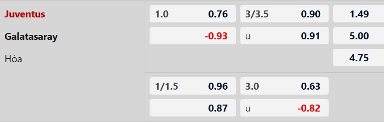 Juventus thua hiệp 1 theo châu Á: Juventus thua hiệp 1 theo châu Á ở 3/4 trận sân nhà gần nhất. Đá với Galatasaray thắng hiệp 1 theo châu Á ở 4/6 trận vừa qua, đội chủ nhà không phải là sự lựa chọn đáng tin cậy.