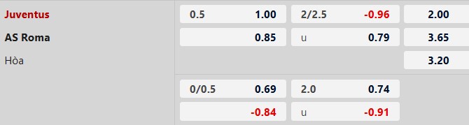 Juventus thắng theo châu Á: 5 trận chính thức gần đây khi được đánh giá cao hơn đối phương, Juventus toàn thắng dù không phải 100% họ đã thắng theo châu Á. Roma thắng theo châu Á 9/11 trận sân khách vừa qua đồng thời còn đang hơn Juve 4 điểm nên việc Lão phu nhân chấp 1/2 bàn là khá sâu. 13 lần đối đầu gần nhất ở Turin khi Juventus chấp 1/2 đến 1 bàn, thành tích theo châu Á của Bianconeri là thắng 11, hòa 1 và thua 1.